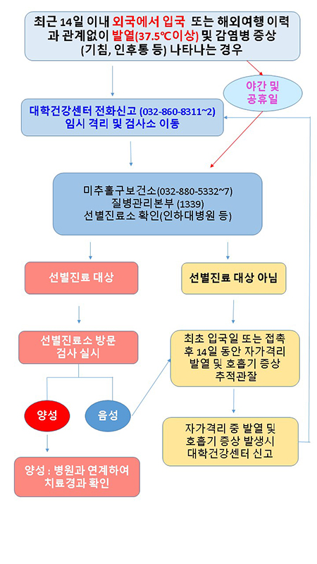 대학건강센터를 열어 열이 나거나 기침, 인후통 등 호흡기 증상이 나타나는 경우 전화상담이나 신고하도록 했다. 신고 내용은 미추홀구보건소와 질병관리본부로 전달한다. 여기에서 다시 진료 대상을 선별하고 바이러스 검사 대상자, 자가격리자로 분리해 관리한다.