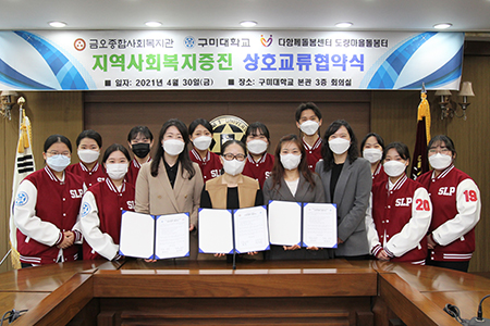 본관 3층 회의실에서 열린 협약식에는 박영미 구미대 언어치료과 학과장, 김휘연 금오종합사회복지관 부관장, 곽민채 도량마을돌봄터 센터장, 구미대 언어치료과 학생들이 참석했다.