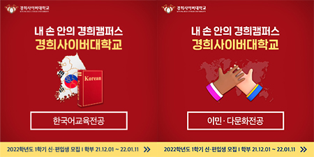 한편 경희사이버대학교는 2022년 1월 11일까지 2022학년도 1학기 신·편입생을 모집한다. 수능·내신 성적과 관계없이 자기소개(80%)와 인성검사(20%)로 선발하며, 고등학교 졸업 이상의 학력을 가진 사람 또는 동등 학력이 인정되는 자라면 누구나 지원할 수 있다. 원서 접수는 입학지원센터 홈페이지www.khcu.ac.kr/ipsi/를 통해 PC 또는 모바일로 하면 된다. 입학과 관련한 자세한 내용은 입학지원센터 홈페이지나 전화를 통해 확인할 수 있다.