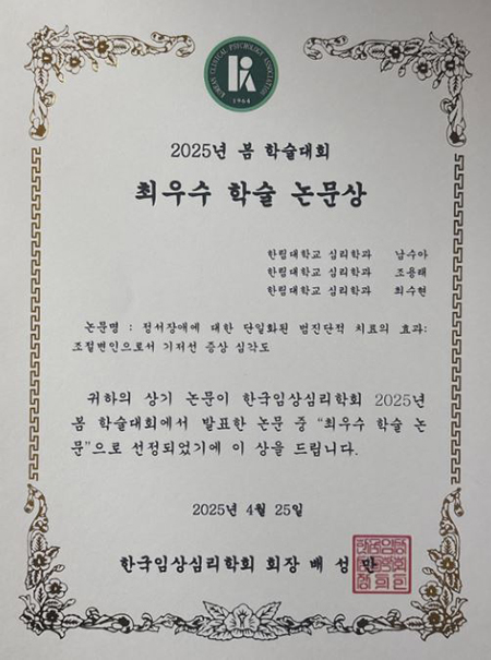한림대학교(총장 최양희) 한림응용심리연구소 남수아 연구교수가 최근 열린 한국임상심리학회 2025년 봄학술대회에서 ‘최우수 학술 논문상(구연 부문)’을 수상했다.
