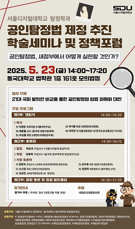 서울디지털대학교(탐정학과)와 동국대학교(법무대학원 탐정법무전공)는 오는 5월 23일 동국대학교 법학관에서 공인탐정법 제정 추진을 위한 학술세미나 및 정책포럼을 공동으로 개최한다.
