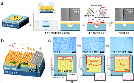 연구팀은 Pd/PDMS/Doped-Si 구조에 초음파 처리를 가해, Pd 박막 표면에 균일한 씨드 균열을 유도하는 새로운 접근법을 제시했다. 이후 수소가 흡착되면 Pd 결정 격자가 팽창해 나노갭이 폐쇄되고, 이를 전기용량 변화로 실시간 감지하는 방식을 적용했다. 이 방법은 기존 공정보다 간단하고 재현성이 높으며, 갭 폭을 20nm 이하로 균일하게 유지할 수 있다는 점이 특징이다.