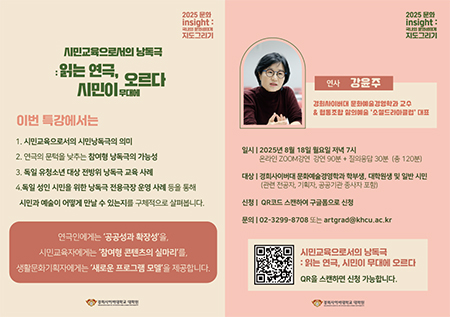 경희사이버대학교 문화창조대학원(총장 변창구) 문화예술경영전공은 <2025년 문화인사이트> 연강 중 세번째 특강을 개최한다. 특강 주제는 <시민교육으로서의 낭독극: 읽는 연극, 시민이 무대에 오르다>로, 오는 8월 18일 오후 7시 온라인 줌으로 진행된다.