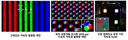 먼저 연구팀은 가교 작용기가 도입된 형광 및 인광 유기발광체를 개발하였다. 이 소재를 활용하여 OLED 발광층을 만들고, 발광층의 열 가교 반응을 유도하여 “단일 상(single phase network) 구조의 유기 발광층 네트워크”를 구현할 수 있었다. 이 유기 발광층 네트워크와 반도체 공정에 사용되는 포토레지스트(PR)를 활용하여 발광층의 패턴 형성과 보호를 동시에 가능하게 하는 “간접 광패터닝 공정”을 개발하였다. 유기 발광층 네트워크 덕분에 패터닝 공정 중 사용되는 유기용매에 의한 발광층의 손상을 막을 수 있었으며, 결과적으로 폭 3 마이크로미터, 간격 4 마이크로미터의 발광층 패턴을 구현하였고, 1인치당 3000개 이상의 초고해상도 적녹청(RGB) 발광층 패턴 배열(3000 ppi 이상) 또한 성공적으로 구현하였다. 이는 기존 금속 마스크 기반 증착 방식으로는 도달하기 어려운 해상도이다.