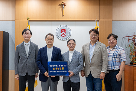 9월 16일(화) 오후 1시 30분, 서강대학교 본관 2층 총장실에서 송태경 대외부총장의 발전기금 전달식이 진행되었다. 이날 행사에는 송태경 대외부총장과 심종혁 총장, 전성률 교학부총장, 신관우 산학협력단장, 이상근 대외교류처장이 참석했다.