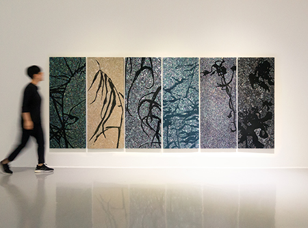 이번 전시에서는 스케치를 비롯해 영상, 평면 자개회화 등 작품 120여점이 공개된다. 메인 홀에서는 120×300cm 크기의 대형 작품 2점, 자갈 형태의 다양한 작품 17점, 병풍 형식의 6폭 작품이 전시된다. 그 중 병풍 작품 ‘신사군자(新四君子)’는 자연의 다양성과 생명의 연속성을 시각적으로 표현하며, 4폭, 6폭, 8폭 등 다양한 형태로 확장이 가능하다.