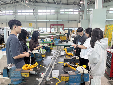 ‘비행시뮬레이터 실습’에서는 BATD(기본 항공훈련장치)를 이용해 비행의 원리와 조종 절차를 배우고, 실제 조종사처럼 이착륙과 선회비행을 체험한다. 중등부 대상 ‘드론 아케이드’에서는 드론의 원리와 조작법을 익힌 뒤 팀 프로젝트를 수행하며 협동심과 문제해결능력을 기르고, 고등부 대상 ‘모의항공관제 실습’에서는 관제사의 역할을 경험하며 상황 판단과 의사소통 역량을 배언다. 또한 ‘항공정비 실습’에서는 연료계통튜브 제작, 기체 연결, 리베팅 등 실제 항공정비 작업을 직접 수행하며 정비사의 역할을 이해한다.
