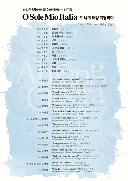 안양시 안양아트센터 수리홀에서 20일(토) 오후 5시에 열리는 ‘오 나의 태양 이탈리아’는 오동국 교수에게서 사사한 안양대 성악전공 학생과 졸업생 등 13명이 참여해 아름다운 우리 가곡과 이탈리아 가곡, 오페라 아리아를 선보인다.