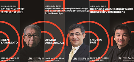 행사의 하이라이트는 오는 10월 17일(금)에 열린다. 이날 대강당에서는 △2024년 프리츠커상 수상자 리켄 야마모토(Riken Yamamoto) △세계 초고층 건축의 혁신을 이끈 구조 엔지니어 아메드 아브델라자크(Ahmed Abdelrazaq), △사회적 기여와 실험적 건축으로 주목받는 시게루 반(Shigeru Ban) 등 세계적 석학들의 특별 강연이 펼쳐질 예정이다.