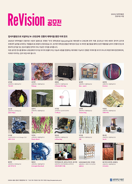 상명대(총장 김종희) 박물관은 10월 20일부터 11월 28일까지 「Upcycling으로 재탄생한 K-규방공예」 ReVision 2차 공모전 전시를 박물관 복합문화공간에서 개최한다. 이번 전시는 문화체육관광부와 한국대학박물관협회가 지원하는 ‘2025년 대학박물관 진흥지원사업’의 일환으로 진행된 「전국 대학(원)생 Upcycling 창작 작품 공모전」에서 선정된 작품 20점을 선보인다.