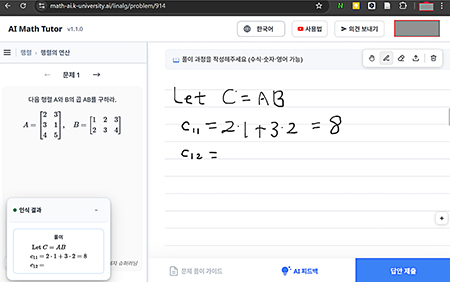 한림대학교(총장 최양희)는 에듀테크 전문 기업인 ㈜슈퍼러닝과 함께 개발한 교과목 특화형 ‘AI 선형대수 튜터’를 2025년 가을 학기부터 정식 도입했다. 본 사업은 교육부 ‘글로컬대학30’프로젝트의 일환으로 추진됐다.