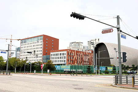 ○ 사진 (3) : 인천글로벌캠퍼스 정문 앞 ‘코튼우드하이츠로’ 명예도로 현장. 연수구는 최근 이 구간(약 1.3km)을 코튼우드 하이츠시와의 우호 협력을 기념해 명예 지정했다.