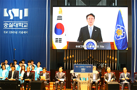 김민석 국무총리는 영상 축사를 통해 “숭실대학교의 128주년을 진심으로 축하드린다”며 “AI와 기독교 정신을 융합한 ‘AI 네이티브 숭실’ 비전이 대한민국의 미래 인재 양성과 산업 발전의 든든한 밑거름이 되길 바란다”라고 말했다.