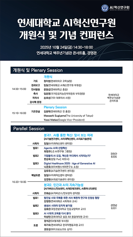윤동섭 총장은 “연세대 AI혁신연구원은 AI를 효율과 속도의 언어로만 바라보지 않고, 사회·인문·의료 등 다양한 영역과의 융합을 통해 AI가 인류의 존엄과 공동체의 가치를 확장하는 길을 찾겠다”며 “깊이 있는 연구와 열린 협력을 통해 책임 있는 AI 시대의 길잡이가 되겠다”고 말했다.