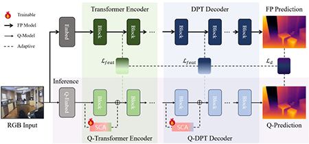 이번에 채택된 논문 제목은 ‘QSCA: Quantization with Self-Compensating Auxiliary for Monocular Depth Estimation’이며, monocular depth estimation 모델 특화 quantization 프레임워크를 제안하였다. 연구팀은 기존의 AI 모델 경량화 기술이 image classification, language modeling 등의 기초적인 작업에 최적화되어 있어 monocular depth estimation, semantic segmentation 등의 심화 작업에서는 성능 하락이 극심한 문제점을 지적하였다.