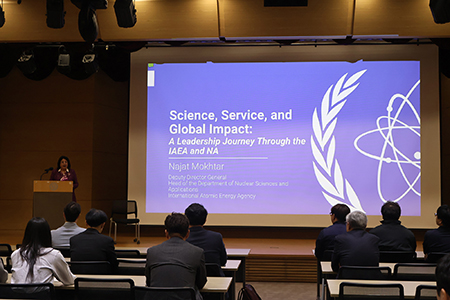 ‘Science, Service, and Global Impact: A Leadership Journey Through the IAEA and NA’를 주제로 한 이번 강연에서 목타르 사무차장은 IAEA의 주요 역할과 활동, 기후 위기 및 환경오염 대응을 위한 원자력 기술의 응용, 그리고 한국과 IAEA 간 협력 확대 가능성에 대해 소개했다.