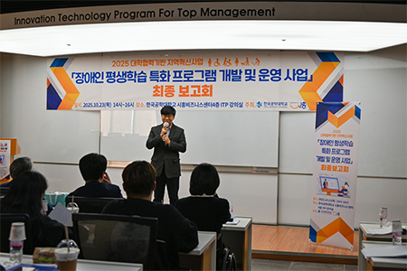 한국공학대학교 대학공유혁신원(원장 김태균)은 10월 23일(목), 시흥비즈니스센터 4층 ITP 강의실에서 「장애인 평생학습 특화프로그램 개발 및 운영사업」 최종보고회를 개최했다.
