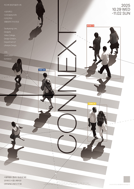 □ 이번 졸업전시의 주제는 ‘CONNEXT’로, ‘연결’을 의미하는 CONNECT와 ‘다음’을 뜻하는 NEXT를 결합한 단어이다. 이는 함께하는 공통의 경험과 각자의 다양한 경험이 서로 연결되어 새로운 성장을 이루고, 이를 바탕으로 미래로 나아가겠다는 젊은 디자이너들의 도전적 메시지를 담고 있다.