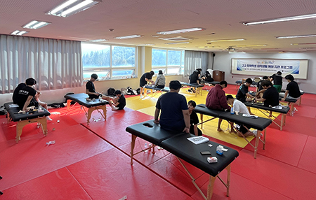 이번 프로그램은 ▲ 스포츠테이핑 실습(팔꿈치·손목·무릎·발목) ▲ 스포츠재활 트레이닝 ▲ 협동적 신체활동 프로그램 등 안양대학교 스포츠과학과의 실제 교과과정을 바탕으로 구성되었으며, 참가 학생들은 대학생 멘토와 1대1로 매칭되어 협동 실습을 진행하며 대학 수업 방식과 학과 분위기를 자연스럽게 경험했다.