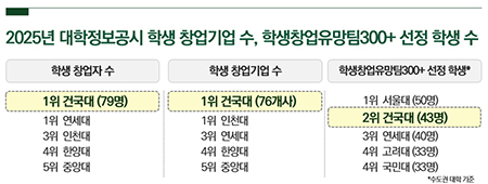 건국대학교의 학생 창업 관련 성과는 교육부 주요 지표에서도 뚜렷하게 나타났다. △2025년 대학정보공시 기준 학생 창업자 수 전국 1위(79명) △최근 4년간 누적 학생 창업기업 수 전국 1위 △학생창업유망팀 300+ 43명 선정(수도권 2위) 등 전국 최고 수준의 실적을 기록했다.