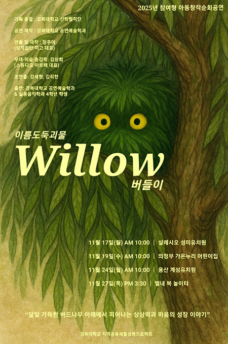 경복대학교 공연예술학과 전공심화과정 학생들이 제작한 참여형 창작아동극 〈Willow-버들이〉가 서울 성미유치원, 용산 계성유치원, 의정부 가온누리 어린이집, 남양주 별내 북놀이터까지 총 네 곳을 순회하며 성황리에 막을 내렸다. 이번 공연은 경복대학교 산학협력단 지역공동체 활성화 프로젝트 사업의 일환으로 진행되었으며, 문화예술사자격증 2급 취득을 위한 교과목 ‘문화예술교육 현장의 이해와 실습’과 연계되어 학생들이 실제 현장에서 공연 기획·제작·진행 전 과정을 직접 경험한 의미 있는 교육 사례로 평가되고 있다.