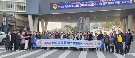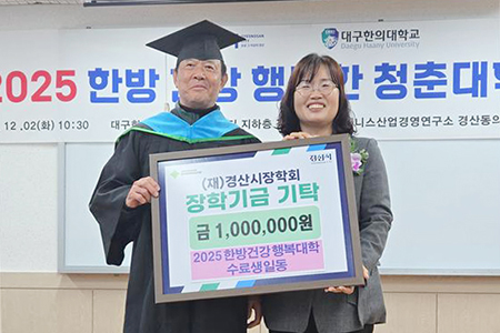 글로컬대학 대구한의대학교(총장 변창훈)와 경산시(시장 조현일)가 시니어 은퇴자를 대상으로 운영하는 한방 웰니스 건강증진 프로그램 ‘2025 한방건강 행복한 청춘대학’ 수료식이 12월 2일 대구한의대 바이오센터 대강당에서 성대히 열렸다.