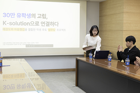 우수한 성과를 거둔 상명대 또래상담 동아리는 지난 12일, 서울캠퍼스에서 김종희 총장과 간담회를 가졌다. 간담회에서는 심무도 프로젝트에 대한 소개와 함께 학생 주도적 소통에 대한 필요성 등 건강한 학내 분위기 조성을 위한 다양한 이야기가 오갔다. 김종희 총장은 "언어와 문화의 장벽을 넘어 외국인 유학생들에게 따뜻한 손길을 내밀어 준 학생들의 노력이 매우 자랑스럽고, 서로를 이해하고 함께 성장하려는 마음이야말로 상명이 지향하는 진정한 공동체 정신"이라며 "특히 또래상담과 함께 태권도와 같은 한국 문화를 직접 체험하며 소통의 폭을 넓힌 활동은 우리 대학의 큰 자산이다" 고 말했다.