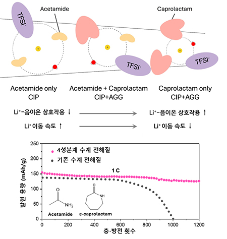 서강대학교(총장 심종혁) 화공생명공학과 류재건 교수 연구팀(제1저자: 조연상 석박통합과정생)은 포항공과대학교(POSTECH) 및 서울대학교 연구진과 협력하여 선형 아세트아마이드(Acetamide)와 환형 카프로락탐(ε-Caprolactam)을 조합한 ‘Dual-amide 기반 4성분계 수계 전해질’을 새롭게 설계하였다.