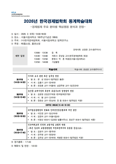 서울시립대학교(총장 원용걸) 법학연구소는 한국경제법학회와 공동으로 오는 2026년 2월 5일(목) 서울시립대학교 백주년기념관에서 「2026년 동계학술대회 및 정기총회」 를 개최한다. 이번 학술대회는 NS홈쇼핑과 홈앤쇼핑의 후원으로 진행된다.