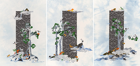 전시장에서 마주하는 섬유공예 작품의 중심에는 패치워크적 구성 방식이 있다. 작가는 각각의 천 조각을 단순히 이어 붙이는 데 그치지 않고, 서로 다른 색과 질감의 조각들을 조화롭게 겹치며 화면 전체를 완성한다. 하나하나 꿰매어 만들어진 작품들은 마치 각자의 삶 속 기억과 감정의 조각처럼 보이며, 하나의 이미지와 이야기로 소소한 일상의 따뜻한 풍경을 풀어낸다.