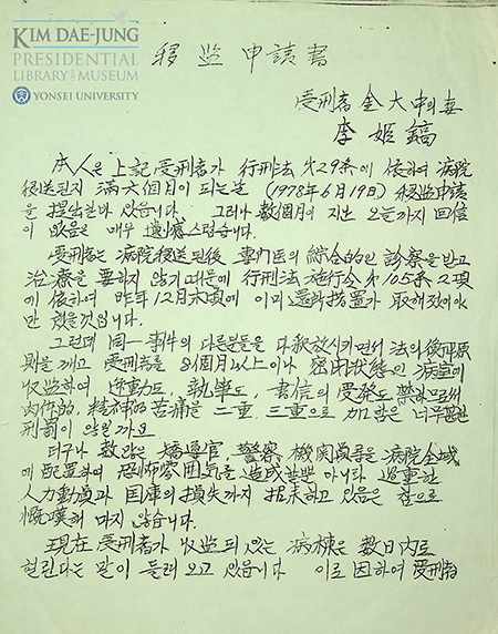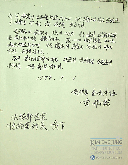 이번에 공개된 1978년 9월 25일자 서한에서 이희호 여사는 자신을 “긴급조치 9호 위반으로 복역 중인 김대중의 처”라고 밝히며, 병원 수감이 치료 목적이 아님에도 장기간 계속되고 있다고 지적했다. 그는 “현재의 병원 수용은 불법이오며 국고의 낭비에 지나지 않습니다”라고 쓰고, “법에 따라 정당하게 복역할 수 있도록 처리 환소해주시기를 앙망합니다”라고 호소했다. 앞서 9월 1일 법무부 장관에게 제출한 이감신청서에서도 행형법 조항을 근거로 환소 조치를 요구하며, 동일 사건 관련자들이 석방된 상황에서 김대중만 장기간 병실에 수감된 것은 형평에 맞지 않는다고 밝혔다.