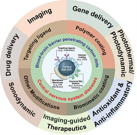 연구팀은 초소형 광발광 탄소 나노입자를 활용해 혈뇌장벽 투과 및 선택적 뇌 축적을 향상시키는 전략을 포괄적으로 정리했다. 표적 리간드, 고분자 코팅, 생체모방막, 엑소좀 유사 구조 등을 이용한 표면 개질을 통해 CD는 혈뇌장벽 투과율을 높이고 뇌에 선택적으로 축적될 수 있다. CD 고유의 형광 특성과 조절 가능한 표면 화학적 성질은 정밀 나노의학 분야에서 특히 주목받는 특성이다.
