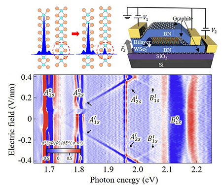 연구팀이 이차원 반도체 물질인 이셀레늄화텅스텐(WSe2)의 두 층 구조에 전기장을 가하면서 광학 스펙트럼을 정밀 측정한 결과, 일반적으로는 거의 보이지 않는 층간 엑시톤 신호가 전기장을 가할수록 점차 강하게 나타나는 현상을 발견했다.