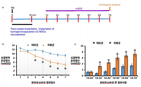 (a) 뇌손상 유발 후 10분 이내에 줄기세포 신경구가 담긴 하이드로젤을 투여하여 1일부터 7일까지 매일 쥐의 상태를 확인하고, 마지막 7일째에 조직 검사를 통해 치료 효과를 입증했다는 계획표다.