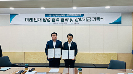 한국공학대학교(총장 황수성)는 19일 시흥시청에서 시흥시인재양성재단(이사장 임병택)과 지역인재 장학사업 추진을 위한 업무협약을 체결하고, 제2캠(TU 리서치파크) 산학협력관 입주기업들과 함께 장학기금 2,510만 원을 기탁했다고 밝혔다.
