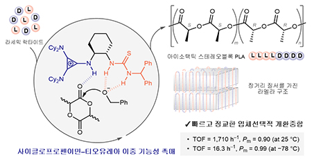 연세대학교(총장 윤동섭) 화학과 김병수 교수 연구팀은 KAIST 화학과 이윤미 교수 연구팀이 개발한 차세대 유기촉매를 활용해, PLA를 훨씬 빠르게 만들면서도 분자 구조를 정교하게 제어하는 방법을 개발했다. 특히 연구팀은 고분자의 ‘분자 배열’을 정밀하게 제어해 스테레오블록(stereoblock) PLA라는 구조를 형성하는 데 성공했으며, 이 과정에서 반응이 진행되는 방식까지 밝혀냈다.