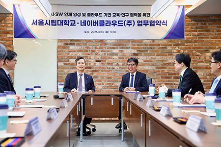 서울시립대학교(총장 원용걸)는 3월 23일(월) 대학본부에서 네이버클라우드(주)(대표 김유원)와 AI·SW 분야 전문 인재 양성과 클라우드 기반 교육·연구 협력을 위한 업무협약을 체결했다.