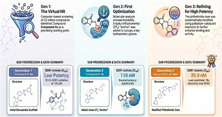 연구팀은 컴퓨팅 기반 분자 설계(CADD) 기법을 활용해 DDR1을 선택적으로 억제하는 신규 화합물 ‘AC-4067’을 발굴했다. 연구팀은 구조 기반 가상 스크리닝과 분자동역학 시뮬레이션 및 자유에너지 계산 등을 통해 DDR1의 결합 구조를 정밀하게 분석하고, 구조-활성 상관관계(SAR) 최적화를 거쳐 후보 물질을 도출했다.