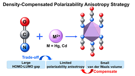 연구팀은 이러한 한계를 극복하기 위해 ‘밀도 보상형 분극률 이방성(density-compensated polarizability anisotropy)’이라는 새로운 설계 전략을 제안했다. 이 전략은 단순히 개별 구조 단위의 이방성을 키우는 기존 접근과 달리, 작고 선형적인 음이온을 고밀도로 정렬시켜 거시적 광학 이방성을 극대화하는 개념이다.