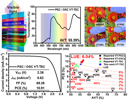 중앙대학교(총장 박세현) 에너지시스템공학부 강동원 교수팀은 대구경북과학기술원(DGIST) 고서진 교수팀과의 협업을 통해 가시광선은 투과시키고 자외선·적외선 영역만 선택적으로 흡수하는 투명 페로브스카이트/유기 모노리틱(monolithic) 탠덤 태양전지를 개발해, 세계 최고 수준의 광이용효율(LUE) 6.04%를 달성했다.
