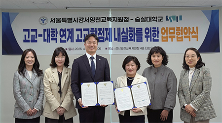 숭실대학교(총장 이윤재)는 4월 7일(화) 서울특별시강서양천교육지원청(교육장 이의란)과 「고교-대학 연계 교육 프로그램 운영」을 위한 업무협약을 체결했다고 밝혔다.