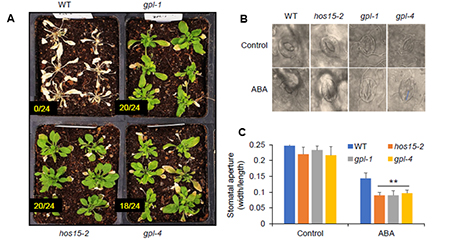 (A) GPS2-like 기능상실 돌연변이 식물은 가뭄(탈수) 스트레스 처리 후 더 높은 생존율을 보여 가뭄 내성이 증가한 것으로 나타났다. (B) 해당 돌연변이 식물은 ABA 처리 시 기공이 더 빠르게 닫히는 특성을 보였다. (C) 기공 크기 분석 결과, GPS2-like 기능상실 돌연변이에서 ABA 반응에 따른 기공 조절 변화가 확인됐다.