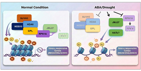 이 과정에서 핵심적인 역할을 하는 것이 식물 호르몬 ABA다. ABA는 수분이 부족한 상황에서 기공을 닫아 수분 손실을 줄이고 스트레스 대응 유전자 발현을 유도하지만, 신호가 지나치게 활성화되면 식물 생장이 억제되고 에너지 소비가 증가할 수 있어 정밀한 제어가 필요하다. 연구팀은 이러한 조절 과정에 후성유전적 유전자 조절 시스템이 관여할 것이라는 점에 주목했다. 후성유전적 조절이란 DNA 염기 서열의 변화 없이 히스톤 변형이나 염색질 구조 변화 등을 통해 유전자 발현을 조절하는 메커니즘으로, 최근 식물 스트레스 생물학 분야의 주요 연구 주제로 주목받고 있다.ㅁ