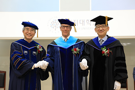 명지대학교(총장 임연수)는 4월 17일(금) 오전 11시 인문캠퍼스 방목학술정보관 1층 국제회의장에서 학위수여식을 개최하고, 국제대학스포츠연맹(FISU) 레온즈 에더(Leonz Eder) 회장에게 명예 교육학박사 학위를 수여했다.