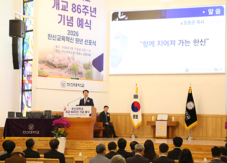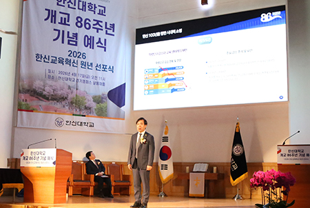 한신대학교(총장 강성영)는 17일(금) 오전 11시 경기캠퍼스 샬롬채플에서 ‘개교 86주년 기념 예식’을 개최하고 ‘2026 한신교육혁신 원년 선포식’을 진행했다고 밝혔다.