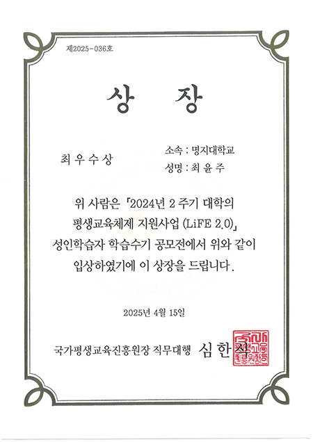 명지대 미래융합대학 졸업생, LiFE2.0 사업 성인학습자 학습수기 공모전 최우수상 수상
