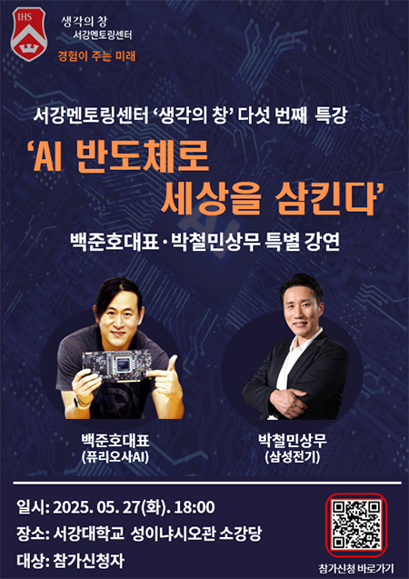- 서강멘토링센터 ‘생각의 창’, AI 반도체 특강 개최, 퓨리오사AI 백준호 대표·삼성전기 박철민 상무·차정훈 전 중기부 실장 한자리에