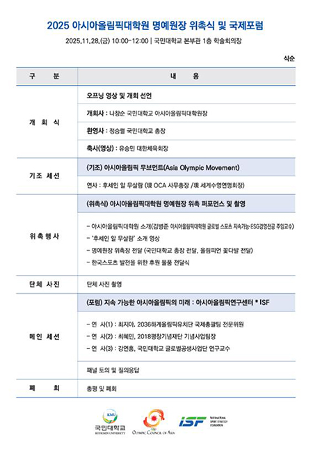 국민대, 국제스포츠전략위원회와 아시아올림픽대학원 명예원장 위촉식 및 국제포럼 개최