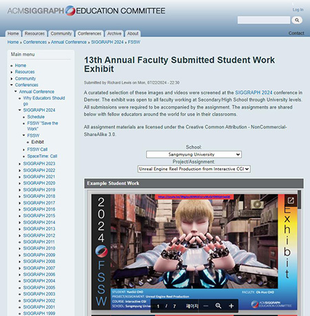 상명대 애니메이션 전공, 컴퓨터 그래픽스 분야 최고의 컨퍼런스 시그라프(SIGGRAPH)에 전시작품으로 선정, 온라인 오프라인 전시