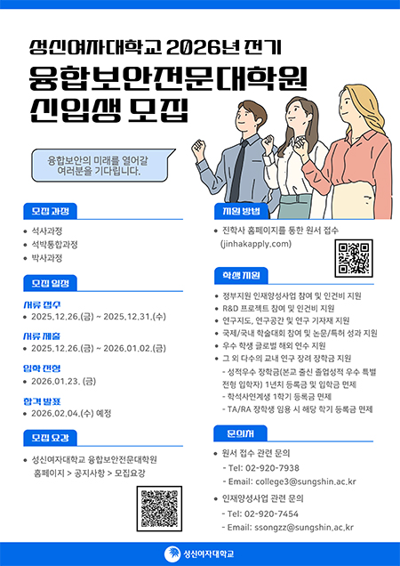 성신여대, 융합보안전문대학원 신설 및 2026학년도 전기 신입생 모집